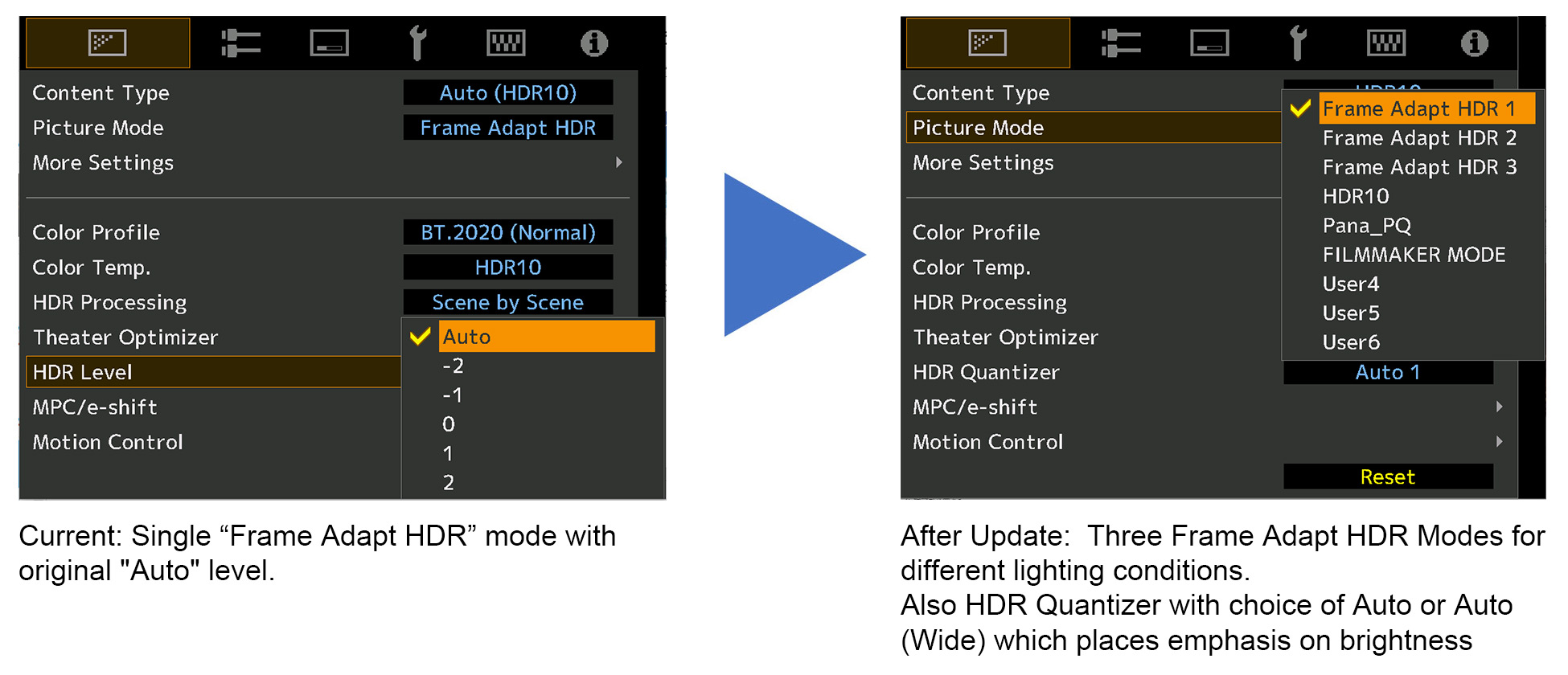 The Frame Adapt HDR technology, which uses a proprietary algorithm to instantaneously analyze the maximum brightness of HDR10 content per frame and adjust the dynamic range in real time to the optimum range for video projection on projectors, has evolved into the second generation. As the culmination of the HDR image processing technology that has been cultivated up to now, the tone mapping algorithm has been completely reexamined in accordance with the scene and frame to achieve HDR images with higher definition creating an immersive three-dimensional feeling by suppressing the whiteness especially in the high brightness area. In addition, the proprietary algorithm for tone curve selection has been improved to reproduce HDR images that are brighter, more colorful, and have a wider dynamic range.
